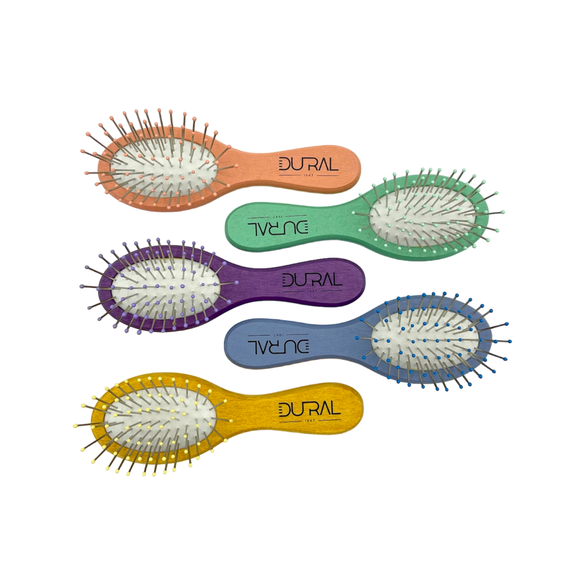 Dural Beech wood rubber cushion mini brush with steel pins and ball tips - assorted colors
